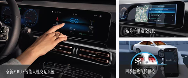 一声“你好,奔驰”,全新带有EQ专属功能的MBUX智能人机交互系统即刻回应你的需求,可根据电动相关功能进行优化,具有气候预控制、EV优化路径规划等贴心功能。