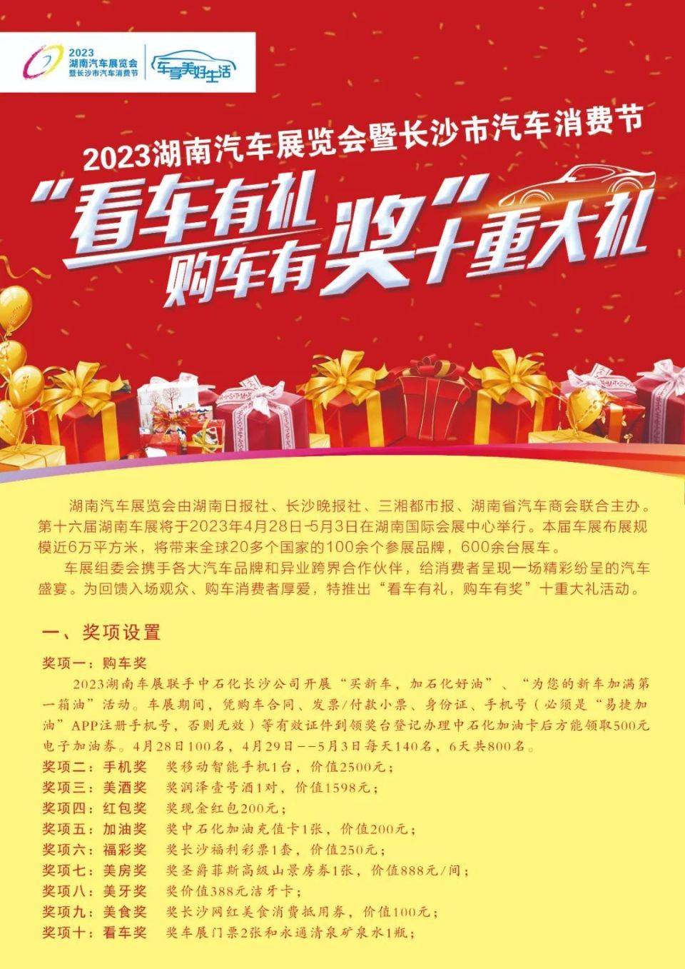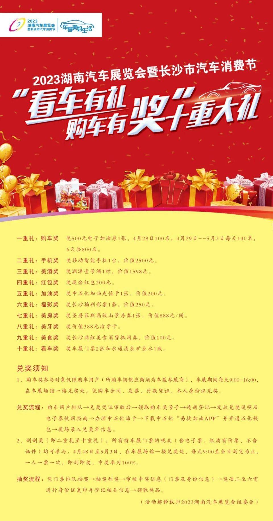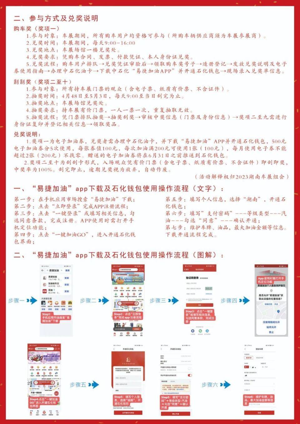 其中,“购车奖”,是“十重大礼”中专门针对购车者的福利。2023湖南车展联手中石化长沙公司开展“买新车,加石化好油”、“为您的新车加满第一箱油”活动。车展期间,所有购车用户均可参与(所购车辆供应商须为车展参展商),每天9时至16时,凭购车合同、发票、付款凭证、本人身份证兑奖,在车展场馆一楼兑奖处兑奖。兑奖流程为购车用户排队→兑奖凭证审验后→领取购车奖号子→造册登记→发放兑奖说明及电子券使用指南→办理中石化油卡→下载中石化“易捷加油APP”并开通石化钱包→现场录入兑奖单信息。